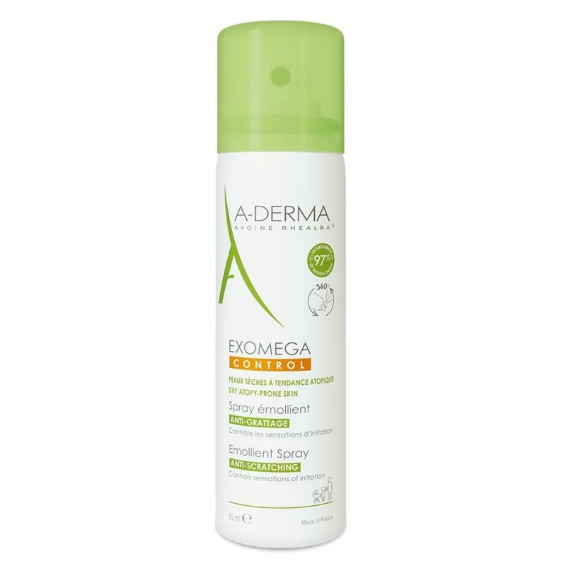 Aderma Exomega Control Spray Émollient Anti-Grattage 50 ml apaise immédiatement inconfort, irritations, sécheresse et réduit les démangeaisons des peaux sèches à tendance à l'eczéma atopique.