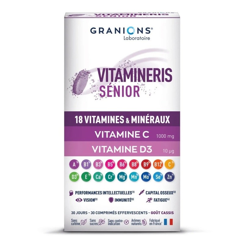 Granions Vitamineris Sénior 30 Comprimés Effervescents améliore les fonctions cognitives. Il contribue à réduire la fatigue et améliore les performances du cerveau. Il aide au maintien du capital osseux et de la vue. Il contribue aux défenses immunitaires. C'est un concentré de 11 vitamines, 7 minéraux et 3 actifs. Cette association unique permet de soutenir votre forme physique et mentale au quotidien. Elle contient notamment de la vitamine B5 et du Zinc qui contribuent aux performances intellectuelles et à la fonction cognitive (concentration, apprentissage, mémoire, motricité).