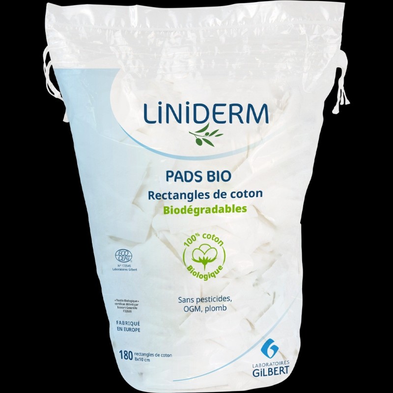 Liniderm Pads Bio 180 Rectangles de Coton 8 x 10 cm sont résistants et ne peluchent pas. Doux et non irritants, ils respectent la peau des tout petits. Spécialement conçus pour un nettoyage en douceur, les Pads Bio de Laboratoires Gilbert sont idéaux pour la toilette du visage de bébé ou pour le soin du change de bébé. Sans pesticides, sans OGM, sans plomb.