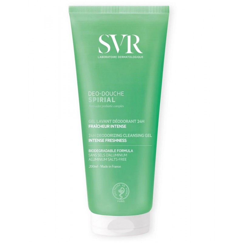 Svr Spirial Déo-Douche Gel Lavant Déodorant 24H 200 ml est un gel douche 2 en 1 : nettoyant et déodorant multi-zones à l’efficacité 24H. Formulé avec un complexe probiotique, le gel douche lutte contre les odeurs corporelles tout en maintenant l'équilibre de la flore cutanée. La peau est fraîche et douce dès la sortie de la douche et les mauvaises odeurs contrôlées tout au long de la journée. Toutes les peaux même les plus sensibles. Adolescent, adulte. Visage, corps, hygiène intime, cheveux.