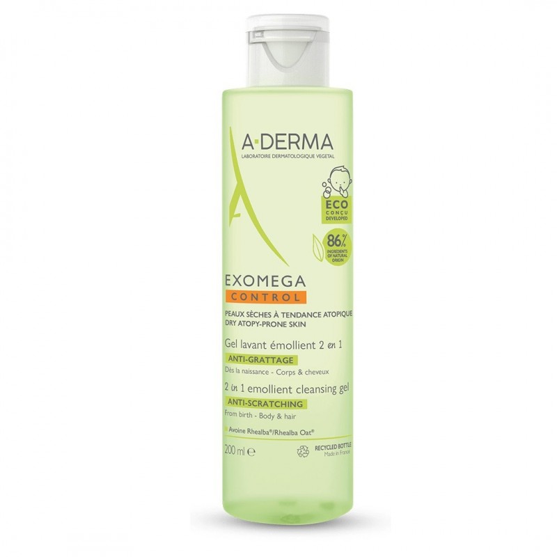 Aderma Exomega Control Gel Lavant Émollient 2en1 Anti-Grattage 200 ml nettoie (visage, corps, cheveux), apaise et protège les peaux sèches à tendance à l'eczéma atopique dès la naissance.