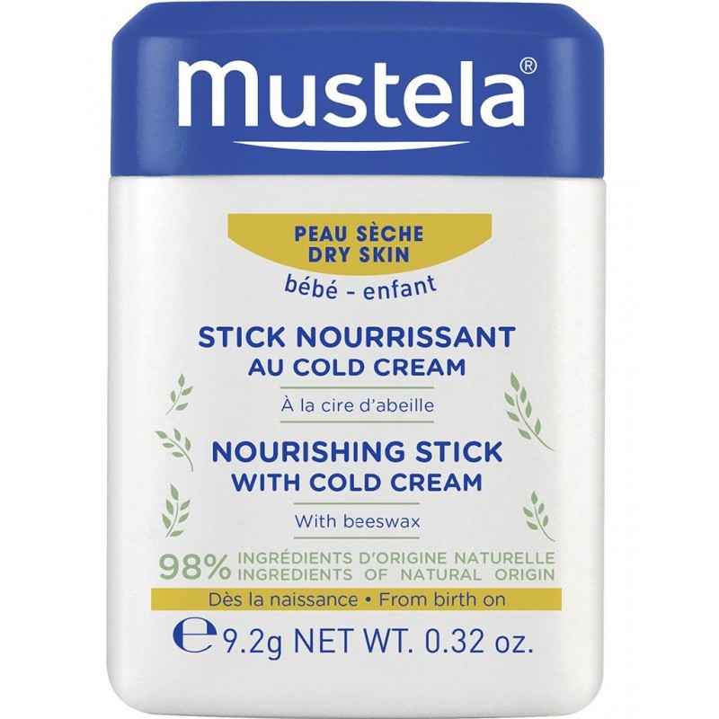 Mustela Stick Nourrissant au Cold Cream à la Cire d'Abeille 9,2 g peut être utilisé sur les zones très sèches du visage, comme les lèvres ou les pommettes. Il convient au bébé dès la naissance et à l'enfant. Ce baume nourrit et protège durablement la peau contre les agressions externes, comme le froid ou le vent. Formulé avec 98% d'ingrédients d'origine naturelle, il contient du Cold Cream naturel, des céramides aux effets relipidants et du beurre de karité.