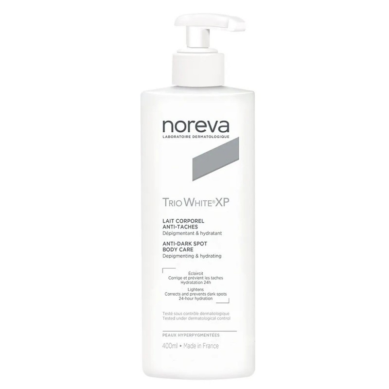 Noreva Trio White XP Lait Corporel Anti-Taches 400 ml corrige les taches et hydrate le corps. Le lait corporel anti-taches est un soin quotidien conçu pour éclaircir la peau, corriger et prévenir l’apparition de taches brunes. Enrichi en agents hydratants, il assure une hydratation intense pendant 24h.