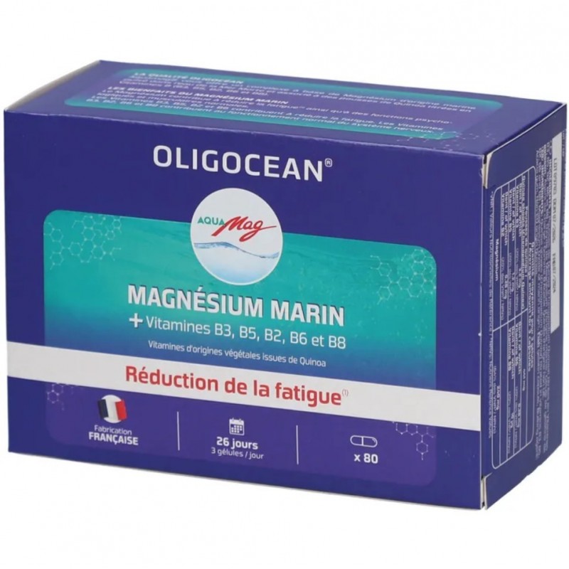 Oligocean Aquamag Magnésium d'Origine Marine 80 Gélules est un complément alimentaire à base de quinoa et magnésium. Le magnésium est un minéral majeur qui contribue à réduire la fatigue, ainsi qu'à des fonctions psychologiques et musculaires normales. Ce complément alimentaire vous offre un complexe à base de magnésium d'origine marine. Le magnésium est obtenu selon un process défini à partir de l'eau de mer de la Mer Morte. Les vitamines B3, B5, B2, B6 et B9 contribuent à réduire la fatigue et les vitamines B3, B2, B6, B8 contribuent au fonctionnement normal du système nerveux.