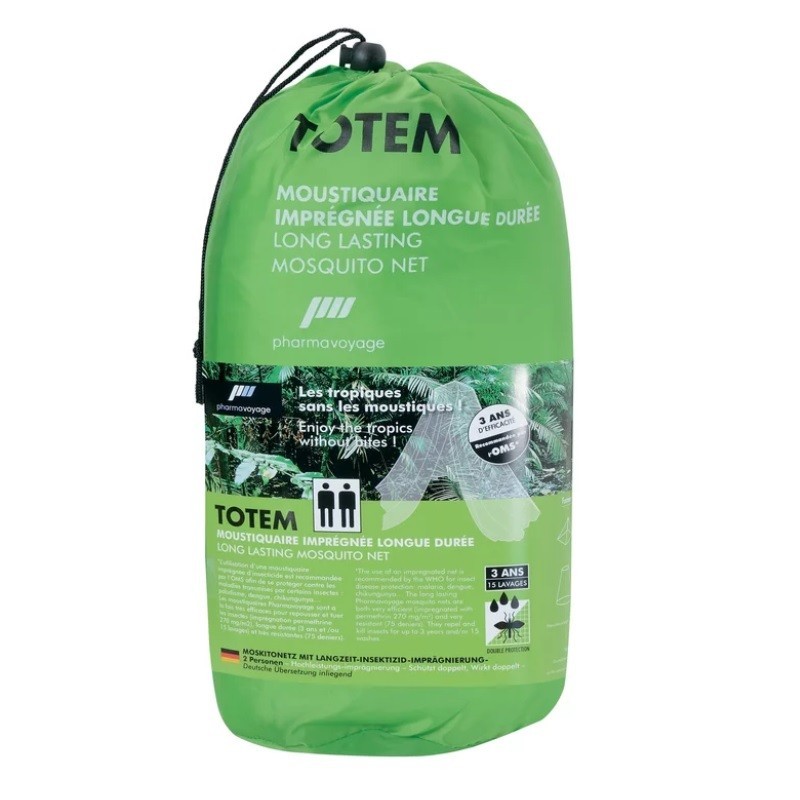 Pharmavoyage Totem Moustiquaire Imprégnée Longue Durée 2 Personnes est une moustiquaire conique permettant de protéger un lit pour deux personnes. Idéal pour les bivouacs ou les voyages itinérants (guest house par exemple). Nécessite seulement 1 point d’accroche.