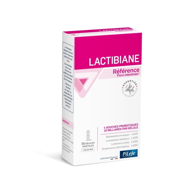 Pileje Lactibiane Référence 30 Gélules est un complément alimentaire à base de 4 souches microbiotiques dosées à 10 milliards par gélule ou par sachet de 2.5 g.