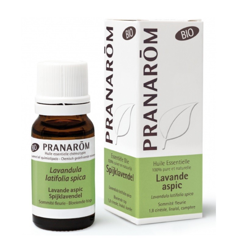 Pranarôm Huile Essentielle Lavande Aspic Bio 10 ml. Cette plante aérienne aime la garrigue du sud de l’Europe et les sols calcaires, craint le froid et présente des fleurs violet pâle disposées en épis lâches, au sommet de longues tiges. La floraison et la cueillette sont plus tardives que la lavande vraie. La lavande aspic fournit une huile essentielle qualifiée d’urgence car elle sera "miraculeuse" pour soulager et guérir de manière quasi instantanée les brûlures sévères et les piqûres de guêpe. En avoir eu besoin dans ces circonstances prouve, s’il en est, que l’aromathérapie est bien une médecine à part entière.