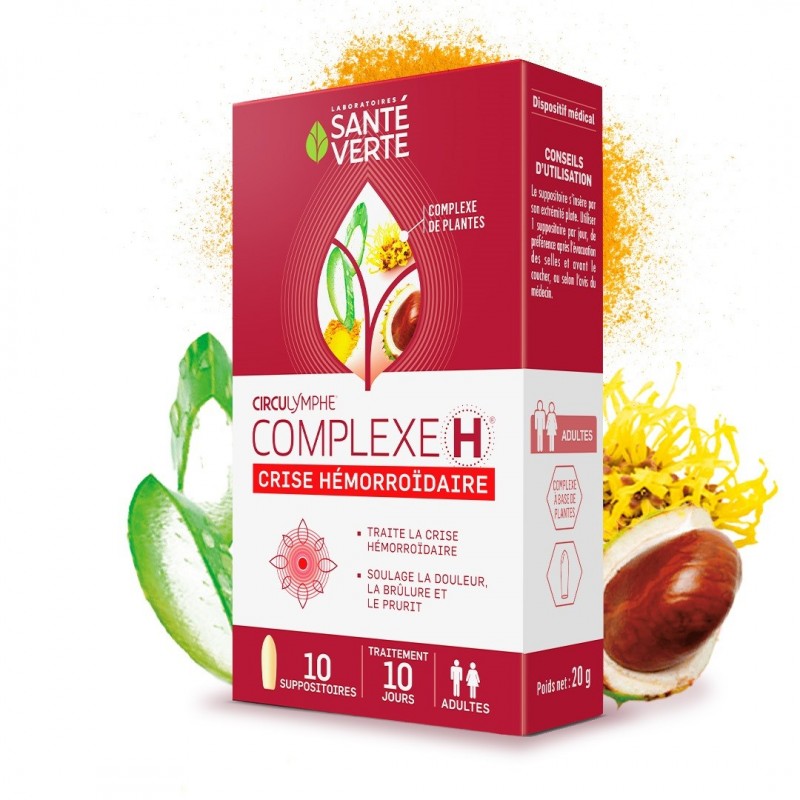 Santé Verte Circulymphe Complexe H 10 Suppositoires est un dispositif médical pour le traitement des crises hémorroïdaires, procitites, rhagades, fissures anales.