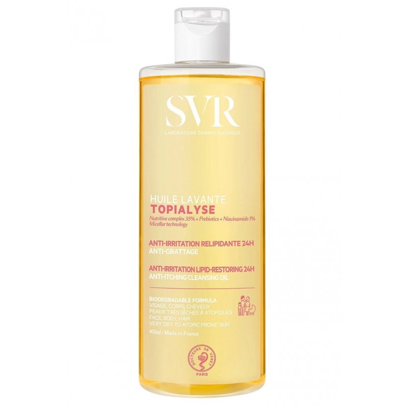 Svr Topialyse Huile Lavante 400 ml est une huile nettoyante douce pour les peaux sèches, sensibles et sujettes aux démangeaisons. Pour toute la famille dès la naissance. Peaux sensibles sèches à très sèches à tendance atopique.