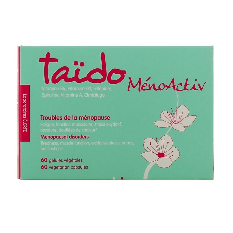 Taïdo MénoActiv 60 Gélules Végétales est un complément alimentaire qui contribue à soulager les troubles de la ménopause : bouffées de chaleur, sudation, irritabilité, nervosité.