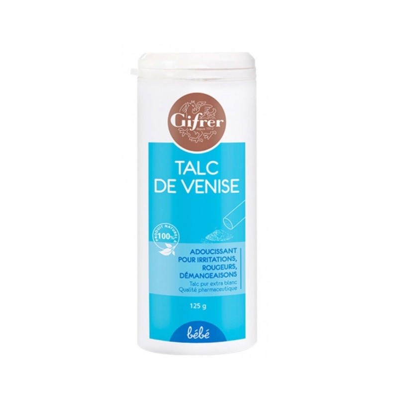 Gifrer Talc de Venise 125 g extra blanc est une poudre légère et onctueuse pour l'hygiène et aux soins quotidiens du bébé et de l'adulte, à action adoucissante, permettant de protèger la peau contre les rougeurs et calme les démangeaisons.