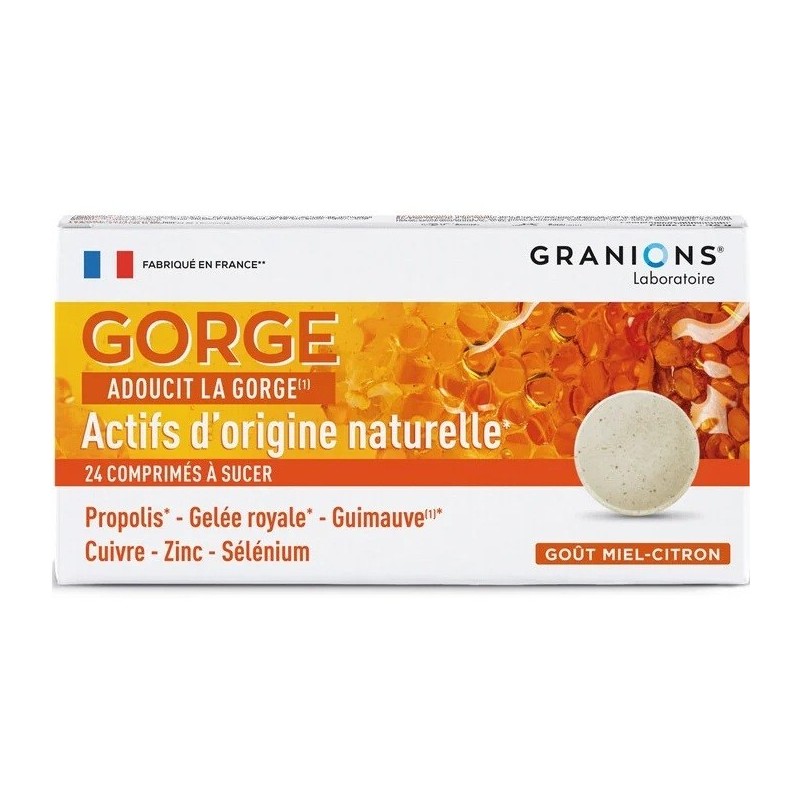 Granions Gorge 24 Comprimés à Sucer adoucit la gorge. Une pastille à sucer qui permet, grâce à la propolis, à la gelée royale, à la guimauve, au zinc, au cuivre et au sélénium, d'apaiser la gorge.