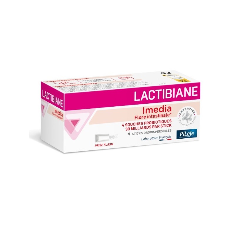 Pileje Lactibiane Imedia 4 Sticks est un complément alimentaire à base de 4 souches microbiotiques dosées à 30 milliards par stick orodispersible. Avec édulcorant.