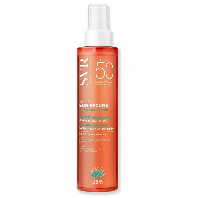 Svr Sun Secure Huile SPF50 200 ml est une protection solaire en format huile non grasse. Une huile sèche au fini satiné non gras et non collant. Sa texture pénètre rapidement pour une peau nourrie, confortable et satinée.