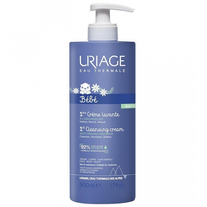 Uriage Bébé 1ère Crème Lavante 500 ml est un soin d'hygiène surgras moussant sans savon. Très agréablement parfumé, ce soin 2 en 1 nettoyant et nourrissant laisse la peau parfaitement propre, douce et hydratée. Recommandé et utilisé en maternité.