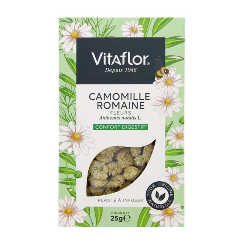 Vitaflor Camomille Romaine Fleurs 25 g est traditionnellement utilisée pour faciliter la digestion.