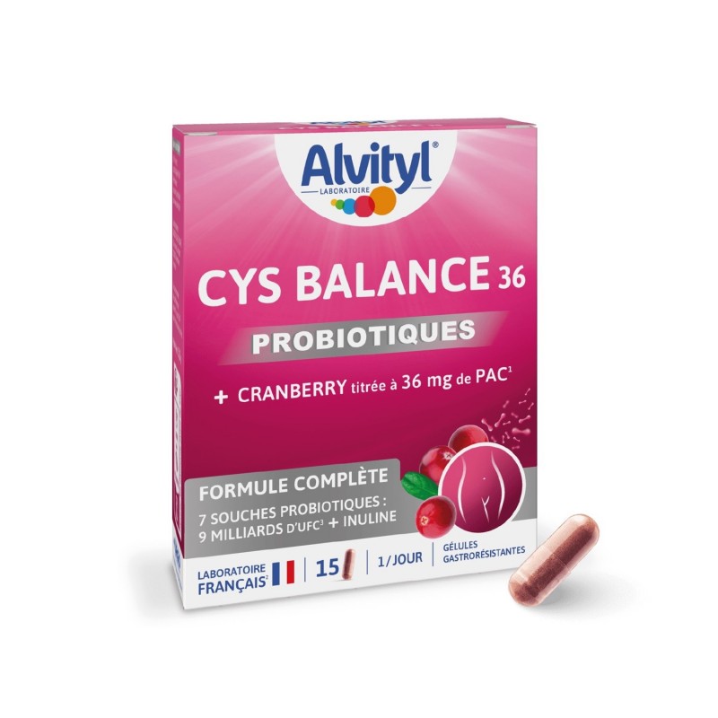 Alvityl Cys Balance 36 15 Gélules est une formule complète qui contient un extrait de cranberry titré à 36 mg de PAC (ProAnthoCyanidines), enrichie de 7 souches probiotiques dosées à 9 milliards d’UFC et d’inuline. Cette combinaison d’ingrédients soigneusement sélectionnés crée une synergie d’action unique. La capsule gastro-résistante est conçue pour protéger les souches microbiotiques jusqu’à leur arrivée dans l’intestin. Les probiotiques contribuent à l’équilibre de la flore intestinale.