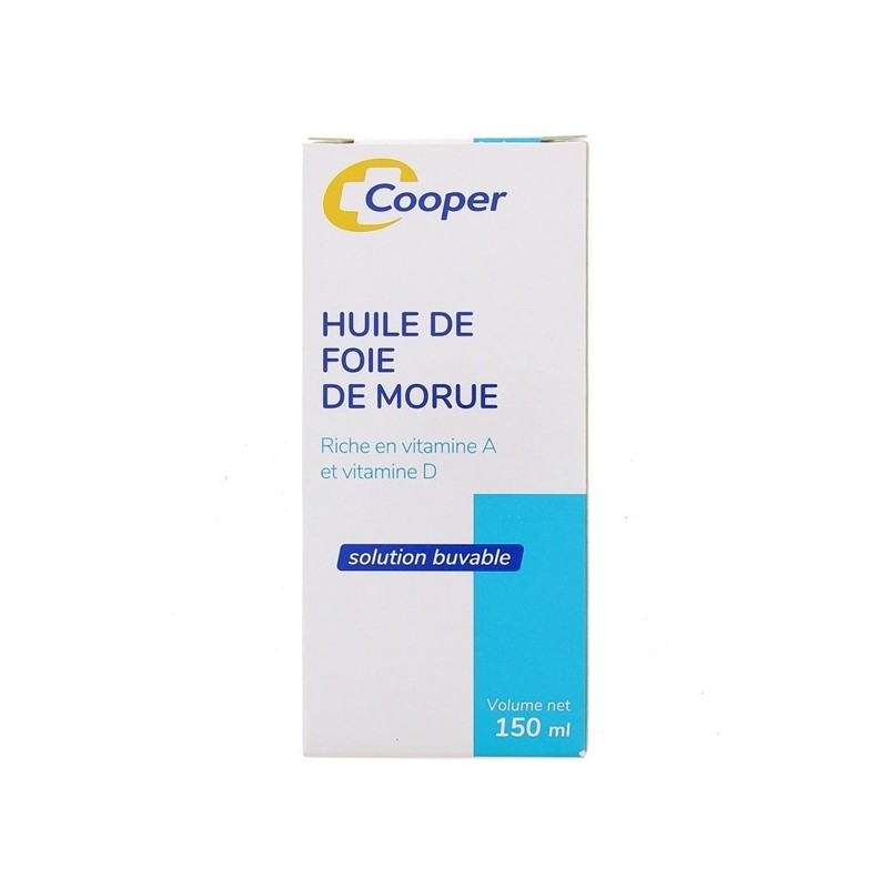 Cooper Huile de Foie de Morue 150 ml sous forme de solution buvable riche en vitamine-A et en vitamine-D.