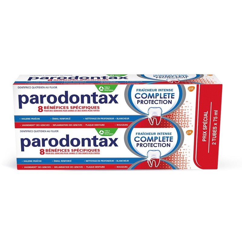 Parodontax Dentifrice Fraîcheur Intense Complète Protection 2 x 75 ml est un dentifrice au fluor aux 8 bénéfices spécifiques pour des gencives plus saines et des dents plus fortes. Il aide à arrêter et prévenir le saignement des gencives, et procure une sensation de fraîcheur et de propreté pendant des heures.