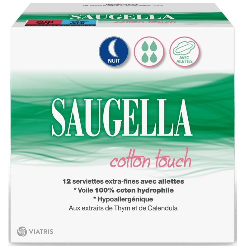 Saugella Cotton Touch Nuit 12 Serviettes Extra-Fines avec Ailettes sont des serviettes hygiéniques et au voile 100 % coton enrichis en micro-capsules de Thym pour assurer confort et protection à toutes les femmes, même les plus sensibles.