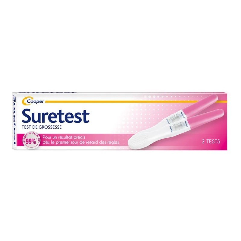 Le Test de Grossesse Suretest x 2 sont simples, fiables et rapides. Résultat dès le 1er jour de retard des règles (sensibilité 25 mUI / mL). Le Test de Grossesse Suretest détecte la présence de l'hormone hCG dans les urines, dès le premier jour de retard des règles, afin de diagnostiquer une grossesse. Fiable à 99%, simple d'utilisation, ce test de grossesse est conçu pour toutes les femmes en attente d'un important changement dans leur vie... Lecture claire du résultat : 2 lignes = positif. Affichage du résultat en 5 minutes.