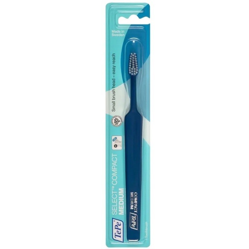 Tepe Select Compact Brosse à Dents Medium est une brosse à dents manuelle au format classique, adaptée aux besoins de tous. Cette brosse ergonomique contient une tête triangulaire dotée de brins très souples à bouts arrondis, pour un accès facile et un nettoyage optimal de toute la dentition. Coloris et motifs selon disponibilité.