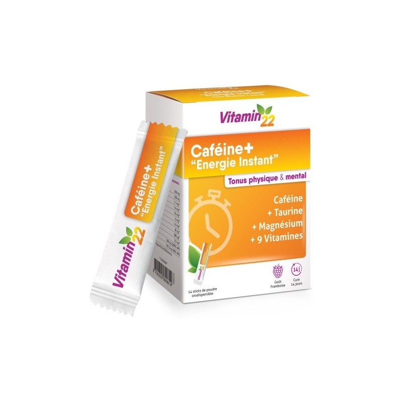 Vitamin'22 Cafeine+ 14 Sticks contient 9 vitamines + magnésium + caféine + taurine.