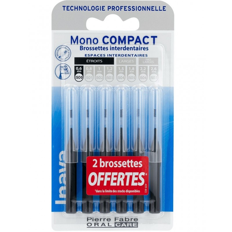 Inava Mono Compact 6 Brossettes Interdentaires Noir 0,6 mm nettoie les espaces interdentaires. Techniques, précises et faciles d'utilisation : les brossettes interdentaires Inava Mono Compact et leurs 2 diamètres de brins facilitent le nettoyage interdentaire des espaces difficiles d'accès. Conçues pour un nettoyage interdentaire efficace, les brossettes interdentaires Inava Mono Compact complètent les gestes d’hygiène bucco-dentaire quotidiens et sont particulièrement recommandées aux personnes porteuses d’implants, d’appareils orthodontiques ou dont les collets dentaires sont dénudés. Leur utilisation permet de réduire la formation de la plaque dentaire, responsable de caries et de gingivites, et consiste en une simple insertion délicate, suivie de quelques va-et-vient. Les brins noirs de la brossette, en contraste avec la blancheur des dents, en facilitent l’insertion et permettent d’observer les dépôts ôtés. Les brins blancs, quant à eux, signalent les saignements occasionnels. Il suffit ensuite de nettoyer la brossette (à l’aide d’un peu de bain de bouche, par exemple) et de la ranger pour une utilisation ultérieure. Afin de ne pas forcer l’insertion interdentaire, le choix de la taille de la brossette est primordial. La gamme est donc composée de 8 références allant de la plus fine (ISO 0) à la plus large (ISO 7), reconnaissables à leurs différentes couleurs et proposées par paquet de 4.