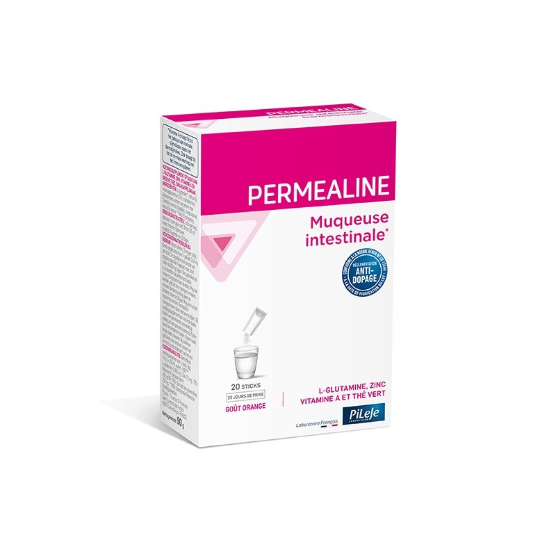 Pileje Permealine 20 Sticks est un complément alimentaire à base de L-glutamine, de vitamine A, de zinc et de thé vert. Avec édulcorant. Saveur Orange. La vitamine A contribue au maintien de muqueuses normales. Le zinc contribue au fonctionnement normal du système immunitaire.