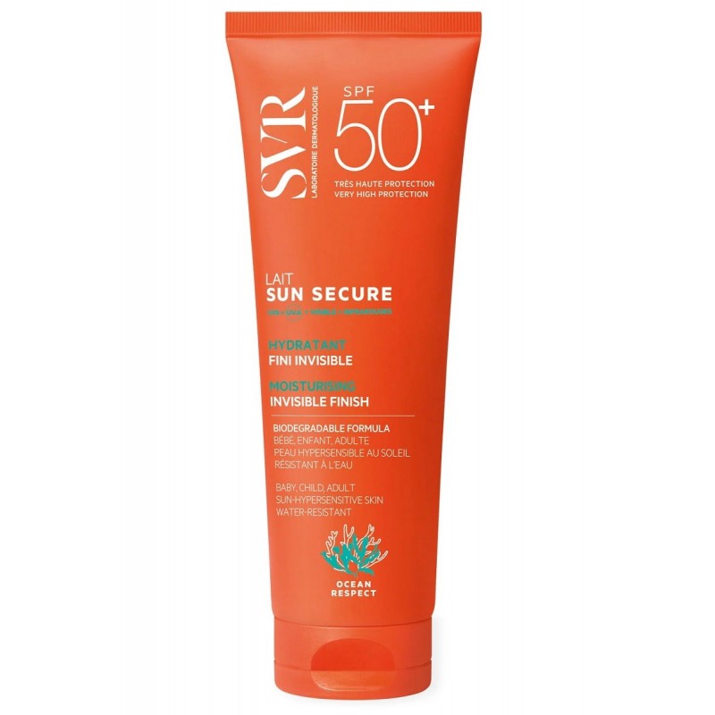 Svr Sun Secure Lait SPF50+ 250 ml est un lait solaire hydratant fini invisible. Un lait fluide et velouté particulièrement adapté aux peaux normales à sèches. Sa texture velours fond sur la peau et laisse un film hydratant et non gras.